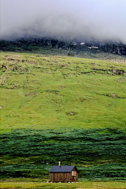 Värdstugan i Staddajåkkå med fjället i bakgrunden.