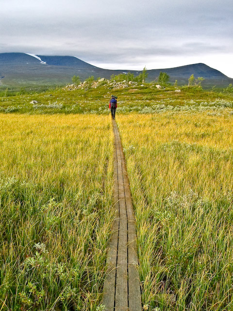 Mal på över Påreks spångar. Pårektjåkkå i moln med Stuor Jierttá till höger.