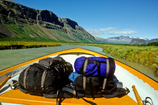 I Läntas båt för att släppas av på Litnoksidan vid Nammásj varifrån det inte finns någon återvändo. Tjakkelis slutning till vänster, Mammásj skymtar längst upp till höger.