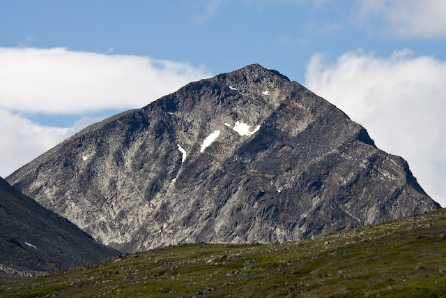Fjället Unna Stuollo poserar i nordväst på andra sidan Jiegnavágge.