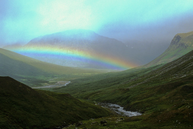 Återigen samma visa. Regnväder avlöser regnväder och vi sitter still utan att komma upp på någon topp. Blicken ned mot Sarvesvagge med Rapadalens Låddebákte bakom bågen.