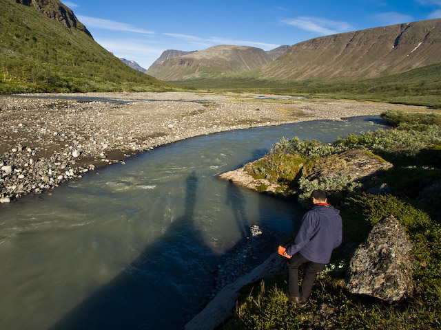 Har nu gått ned i Sarvesvágge och går ut mot Padjelanta.Om man inte kan undvika att få med sin egen skugga i bilden återstår att försöka göra den till en del av kompositionen. Bilden tagen mot öster.