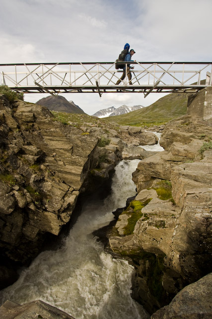 Högt över Smájllájåhkås ravin. Är av tillfällig natur då den lyfts bort med helikopter efter varje säsongs slut. Sarektjåhkkå skymtar i bakrunden under bron.