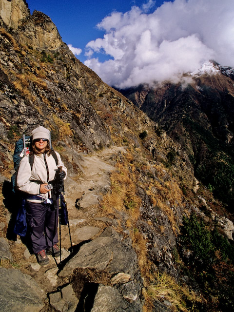 Heli poserar på en stig vi finner något brant. Passerat Khumjung och ska nu gå längs bergsidan upp till Mong för vidare vandring upp Gokyodalen.