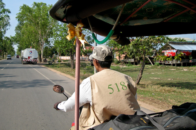 Upphämtade på flygplatsen i Siem Reap av en mopeddragen släpvagn, en s.k. Remorque. Ett hett välkomnande till Kambodja.