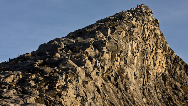 Den officiella toppen av Mt Kinabalu. Drygt 120 vandrare gör turen varje dygn. Kvoten är satt till 125. Alla skulle inte få plats på toppen samtidigt. Är det tur eller "tur" att just Low's Peak är den högsta? Är nämligen den enda topp på berget som är möjlig att nå utan klätterkunskaper.