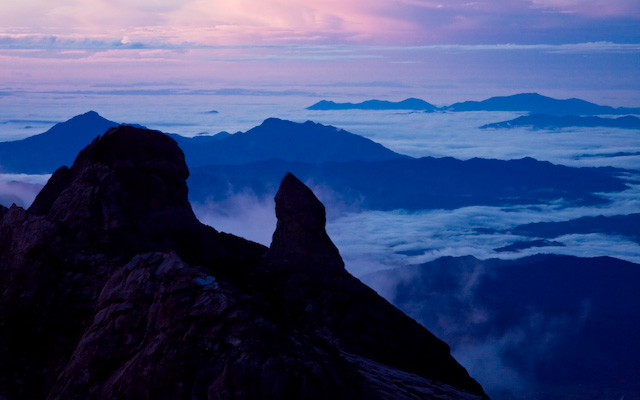 Klockan är 5.46 på morgonen och vi står huttrande på toppen av Mt Kinabalu och väntar på gryningen. Men någon solskiva direkt över horisonten blir det inte. De rackarns molnen är i vägen. Så är det nog alltid. Har nu sett fem soluppgångar från toppen av Kinabalu.