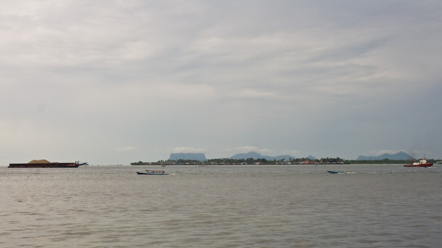 Bogserbåten till höger i bild, pråmen till vänster. Däremellan är ett rep uppspänt. Hyfsat långt, som synes. Bild från Semporna, Sabah, Malaysia.