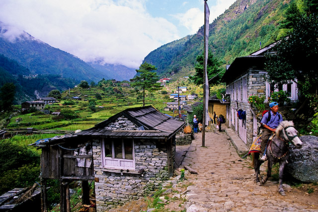 Som leden ter sig efter Lukla. Följer dalgången upp mot Namche, passerande vad vi uppfattar som pittoreska byar. Inga som helst motorfordon eller ens något med hjul. Alla tar sig fram med hjälp av fötter, hovar eller klövar.