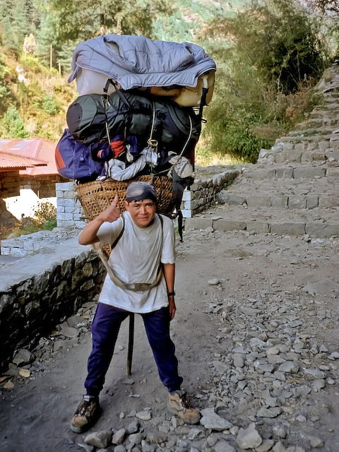 Att vara bärare på Everestleden är inget arbete för veklingar. De kan lassa på upp till 100 kg på sina ryggar. Oftast vill de inte vara med på bild. Yrket har ingen hög status. Här bad jag extremt artigt. Han bär hela lasset genom att trycka bandet över pannan och låta hela ryggraden bära upp. När han går stödjer han sig på käppen, när han vilar placerar han den som här under korgen och lutar sig sedan mot hela lasset. Ett ohyggligt tungt arbete som kräver sin tribut av döma att man sällan eller aldrig såg några medelålders bärare.