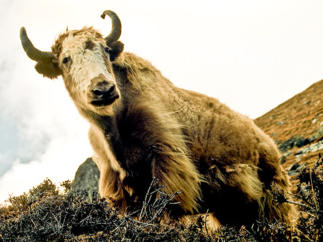 En ovanligt mycket sådan. Jakarna har sina vilda förfäder betydligt närmare i tiden än våra kor, vilket också brukar märkas på det eldigare temperamentet. Denna hedersjak lät sig dock helt villigt fotograferas halvt underifrån med vidvinkel en bit upp på Gokyo Ri. Långa sträva ull vilka av bekvämlighetsskäl ej äro lämpade för långkallingar utom förstås då för jaken själv.