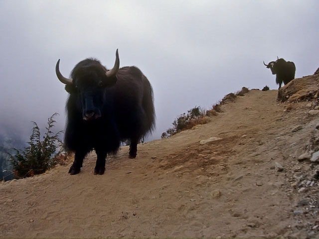 Vågade uppenbarligen inte dela stig med en främling beväpnad med EOS. Bilden tagen på leden strax utanför byn Pangboche på knappa fyratusen meters höjd. Bakgrundsingrediensen är kvällsdimma.