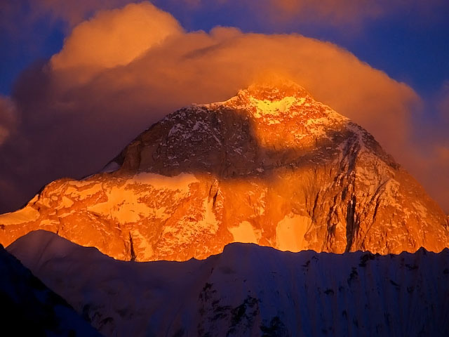 Makalu i dagens sista ljus, så som det ter sig med 300 mm tele från Chukung Ri. Detta 8463 m höga berg, världens nr 5, har en ständigt rödskimrande lyster även utan förstärkning av kvällstrålar. Områdets geologiska karta ger en förklaring. Berget har rikligt med kalifältspat i sig.