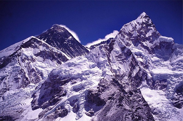 Mt Everest så som det ter sig från Kala Pattar med 38 mm vidvinkel. Spetsiga toppen till höger är kortsidan av Nuptsekammen och i mitten skymtar Lhotse. Bilden är från 1998 och är tagen efter en snörik och sen vinter, vilket också gjorde att luften var ovanligt kristallklar för att vara slutet av mars.