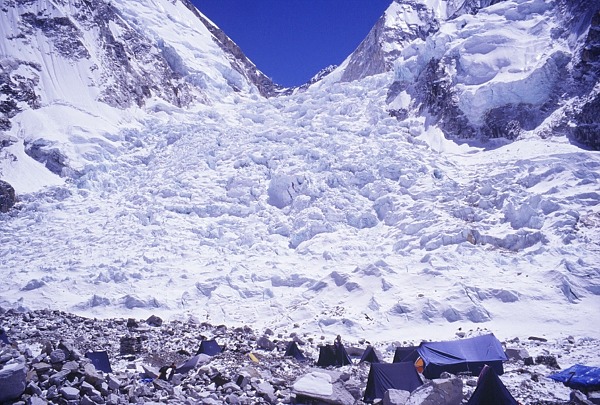 Khumbus stora isfall med tält tillhörande Everests basläger i förgrunden. Att ta sig igenom isfallet är Everestklättrarens första uppgift. En uppgift som för många klättrare också blir den sista. Glaciären faller tusen höjdmeter och nya sprickor i isen öppnas ständigt upp vilka sedan sluter sig kring de som dråsat i. Efter några år kan man komma ut en bit längre ned. Bilden är från mars 1998.