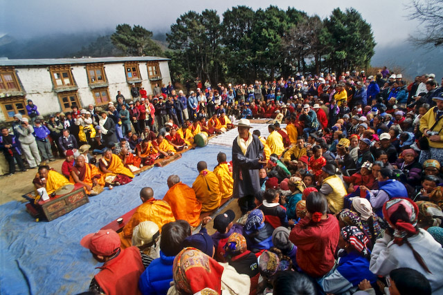 En munk sitter och mässar böner innan varje festdeltagarna får gå fram en i taget och ta emot lamans välsignelser.