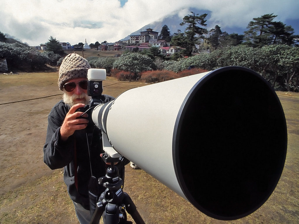 Nils Sjöström. Med 20 kg kamerautrustning reser han runt två år i Asien. Många fotografer hade samlats i Tengboche för Mani Rimdufestivalen, amatör som professionell. Men Nisse såg ut att vara den mest hängivne av dem alla. Här poserar han med sitt 500 mm teleobjektiv. Klosterbyggnaden i bakgrunden.
