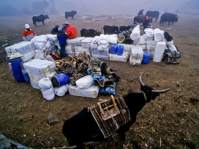 Med nittio fullastade jakar plöjer den japanska Lhotse South Face 2003 Expedition in till Tengboche till allas stora förundran.
