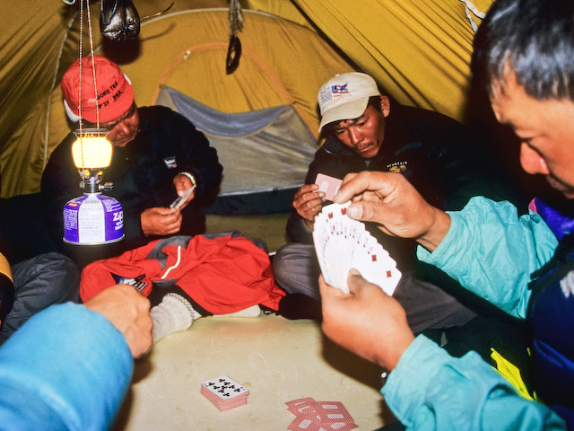 Ett gäng Sherpas avslutar dagen med kortspel i tältet. Mannen till vänster är Nawang Yonden Sherpa som 1983 blev förste nepales att vinterbestiga Mt Everest. På sin vänstra sida har han Mingma Tsiri Sherpa, som när bilden togs hade nått Everests topp nio gånger, bland annat tillsammans med Göran Kropp 1999.