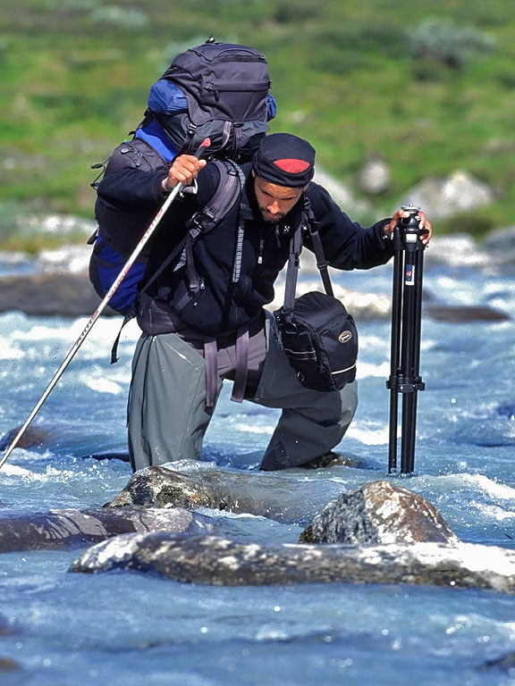 Carlos vadar Suottasjåhkå och tar hjälp av stativet som extra stöd. Augusti 2004.
