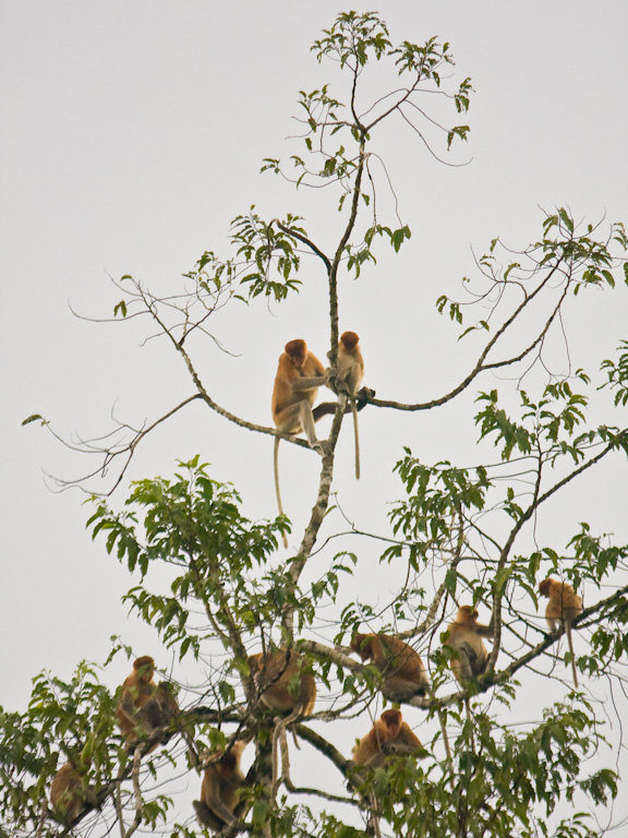 Kom upp här, Miss! Ett gäng näsapor i ett träd vid Kinabatangan. En dominerande hanne, som sitter högst upp, och i övrigt en flock av honor och barn/ungdomar.