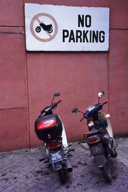 Ibland spelar det ingen roll hur tydlig och välplacerad en skylt är. Informationen går ändå inte hem. Från en bakgata i Kuala Lumpur.