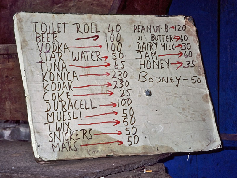 En skylt på vandringsleden in mot Annapurna Sanctuary anno 1998. Denna logdeägare listade upp sina produkter i associationsordning. Det viktigaste och mest efterfrågade först. Sedan hakade resten på i en naturlig ordning. Skylten säger rätt mycket om hur vardagen för en Nepalvandrare gestaltar sig.
