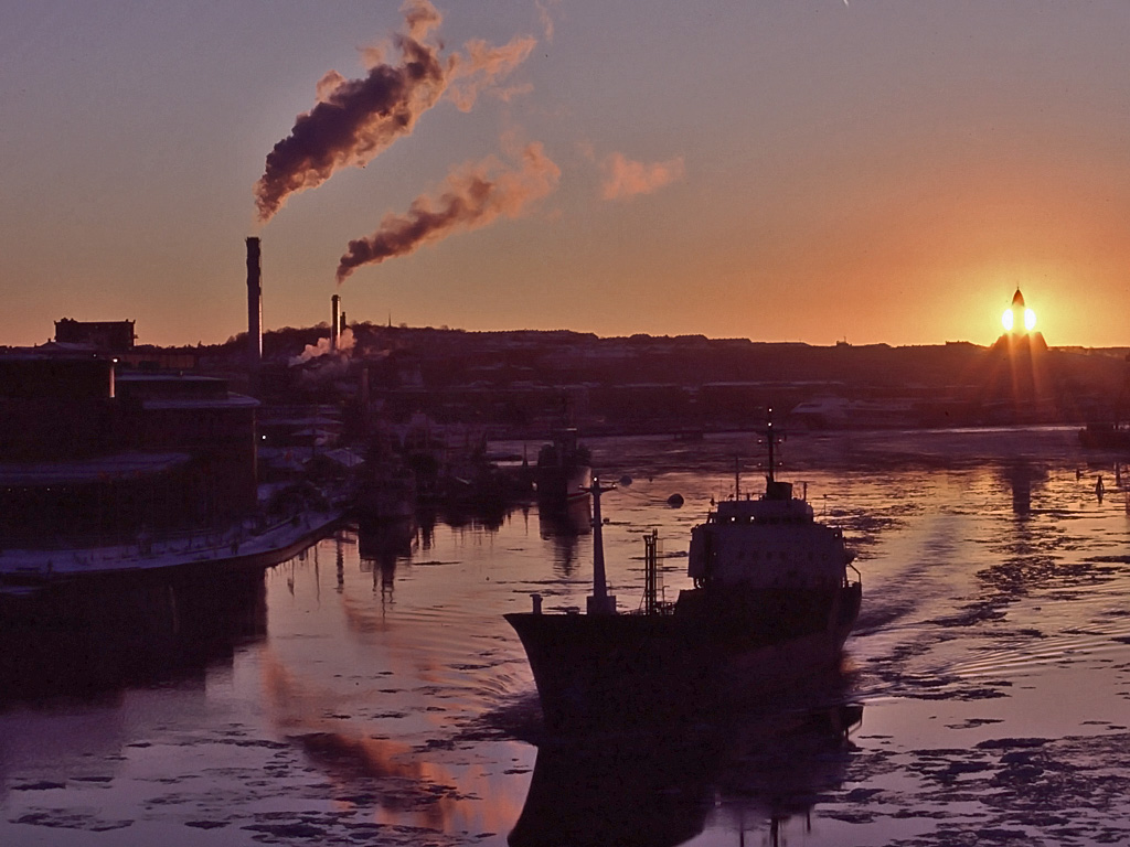 Bild från Götaälvbron. Solen rätt bakom Masthuggskyrkan.