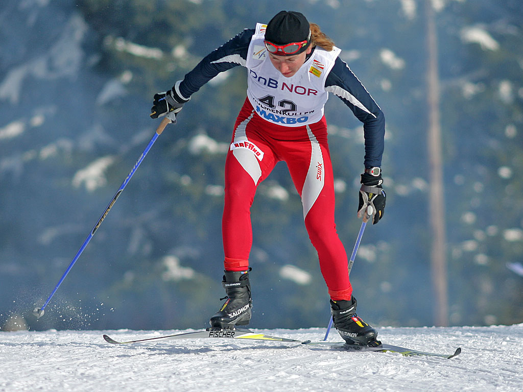 Polskan Justyna Kowalczyk ångar på i sin karaktäristiskt kraftfulla stil under damernas tremil i Holmenkollen.