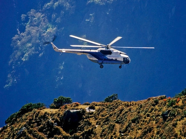 Helikopter går in för landning på Syangboche, ovanför Namche. Ombord finns ett japanskt TV-team som producerar program om Världsarv jorden över.